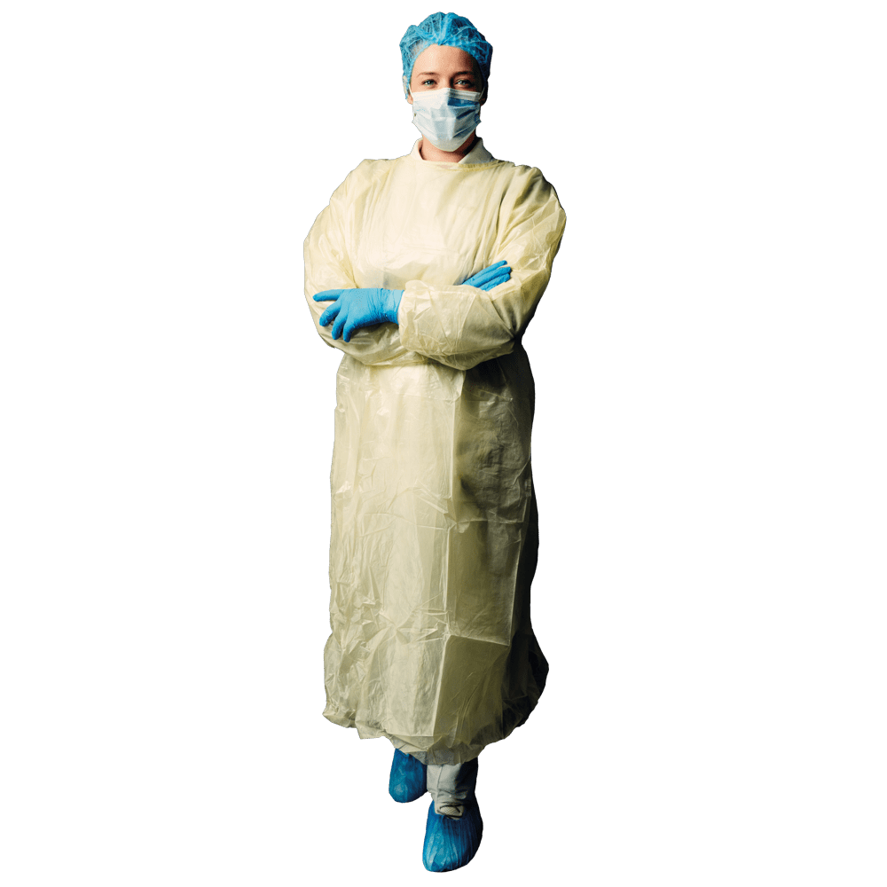 Además, la bata de PP para visitantes está parcialmente recubierta con polietileno. Como equipo de protección personal según la categoría III del reglamento (UE) 2016/425, esta bata ofrece protección frente a riesgos graves para la salud que pueden causar daños irreversibles o incluso la muerte. Los puños de punto aseguran las mangas, y el cierre se realiza mediante cintas. También es importante destacar que esta bata es parcialmente laminada, libre de látex y está plegada individualmente. La fabricación sin látex natural asegura una buena compatibilidad con la piel, siendo apta para personas alérgicas.