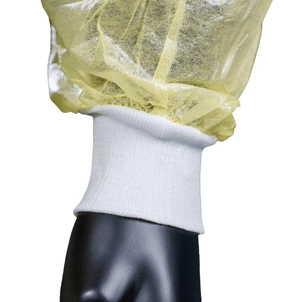 Información sobre el producto "Bata protectora no tejida con revestimiento parcial de PE, talla L / XL, color amarillo, no tejida, Med-Comfort: bata desechable para atar, con puños de tricot para un ajuste seguro en el brazo."