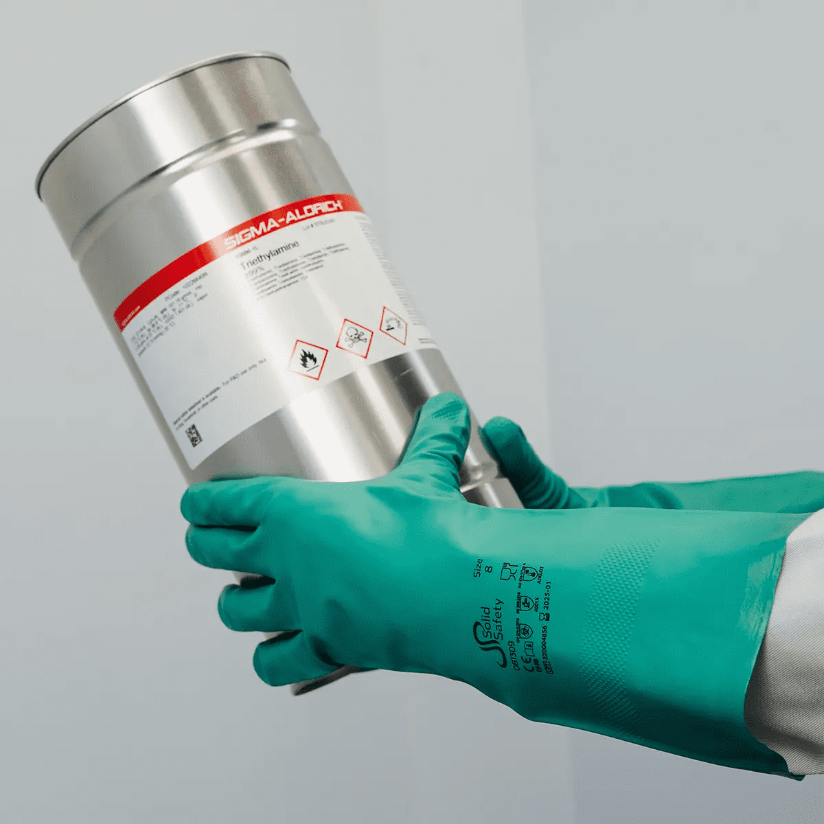Información sobre el producto "Guante industrial, tipo A, talla 9, verde, Solidsafety Clean Protect: comprar guante de seguridad industrial resistente a los productos químicos, fabricado en nitrilo y adecuado para el sector alimentario como EPI de compra."