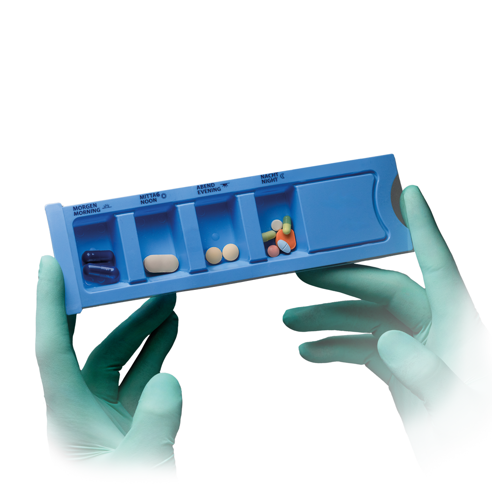 El dispensador de medicamentos está hecho de polipropileno/PVC. Muchos productos médicos se fabrican con ese material, ya que es fácil de procesar y es un producto muy ventajoso. Además, el plástico suele ser elástico y resistente mecánicamente, por lo que es un material ideal y resistente para este dispensador de medicamentos. El dispensador de medicamentos se cierra firmemente con un blíster deslizante.