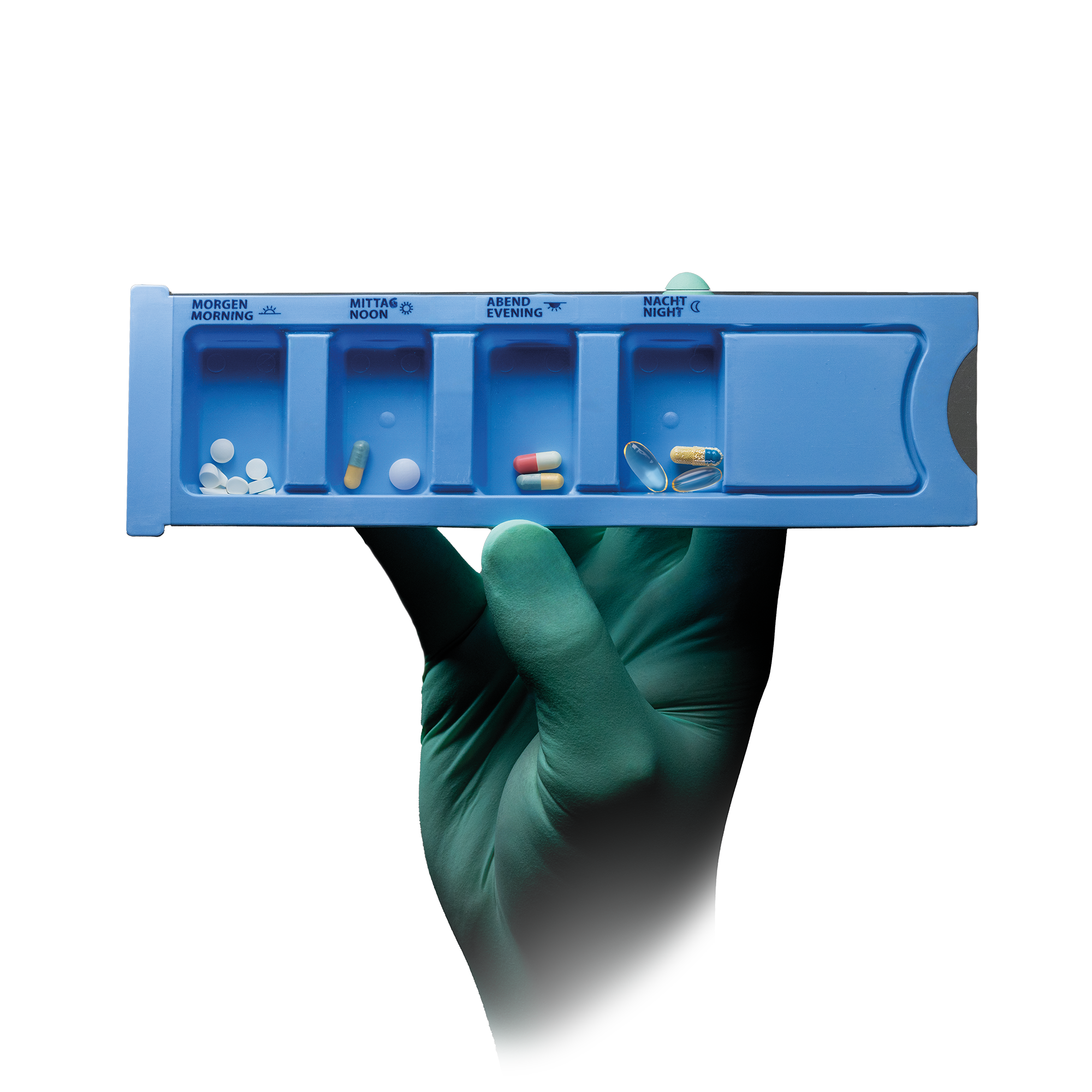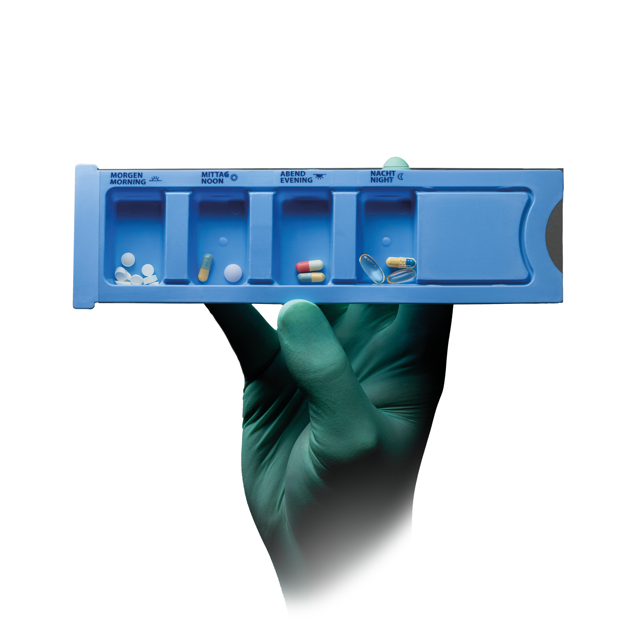 Por último, hay que añadir las siguientes propiedades del dispensador de medicamentos: impresión blanda, blister deslizante, 4 compartimentos, impresión en alemán y impresión en inglés.