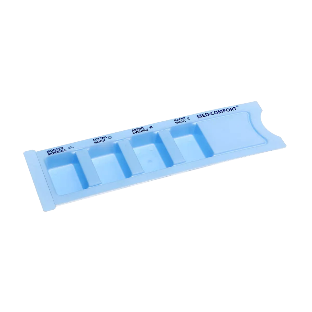 Información sobre el producto "Dispensador de medicamentos desechable de PP, 4 compartimentos, 22,2 x 6 x 1,5 cm, azul, Med-Comfort: comprar el blíster deslizante de polipropileno con tiempos diarios impresos para almacenar las necesidades diarias de medicamentos como suministros de la"