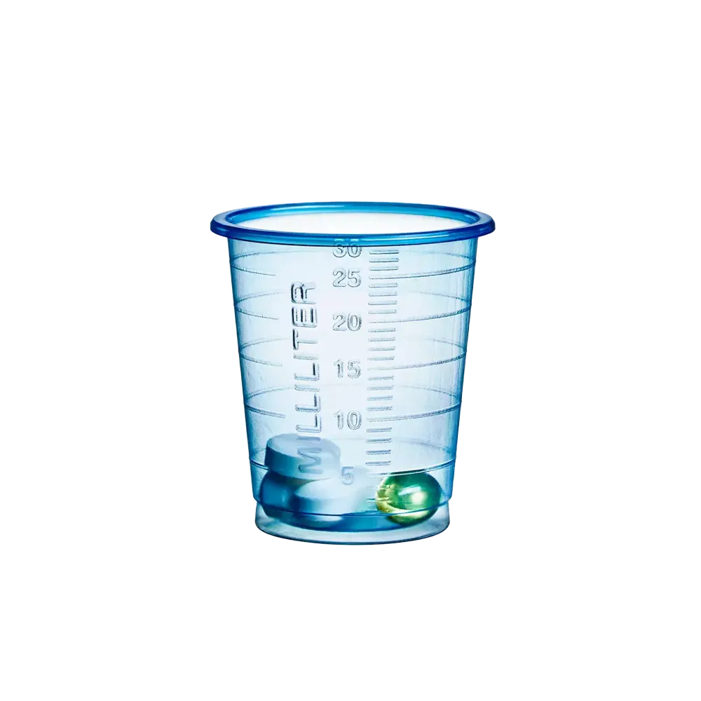 Información sobre el producto "Vaso de medicina desechable PP Eco, 30 ml, graduado, azul, Med-Comfort Eco: comprar vaso de polipropileno médico producido de forma sostenible con función de medición para la dosificación de líquidos y la dispensación de medicamentos como suministros de s"